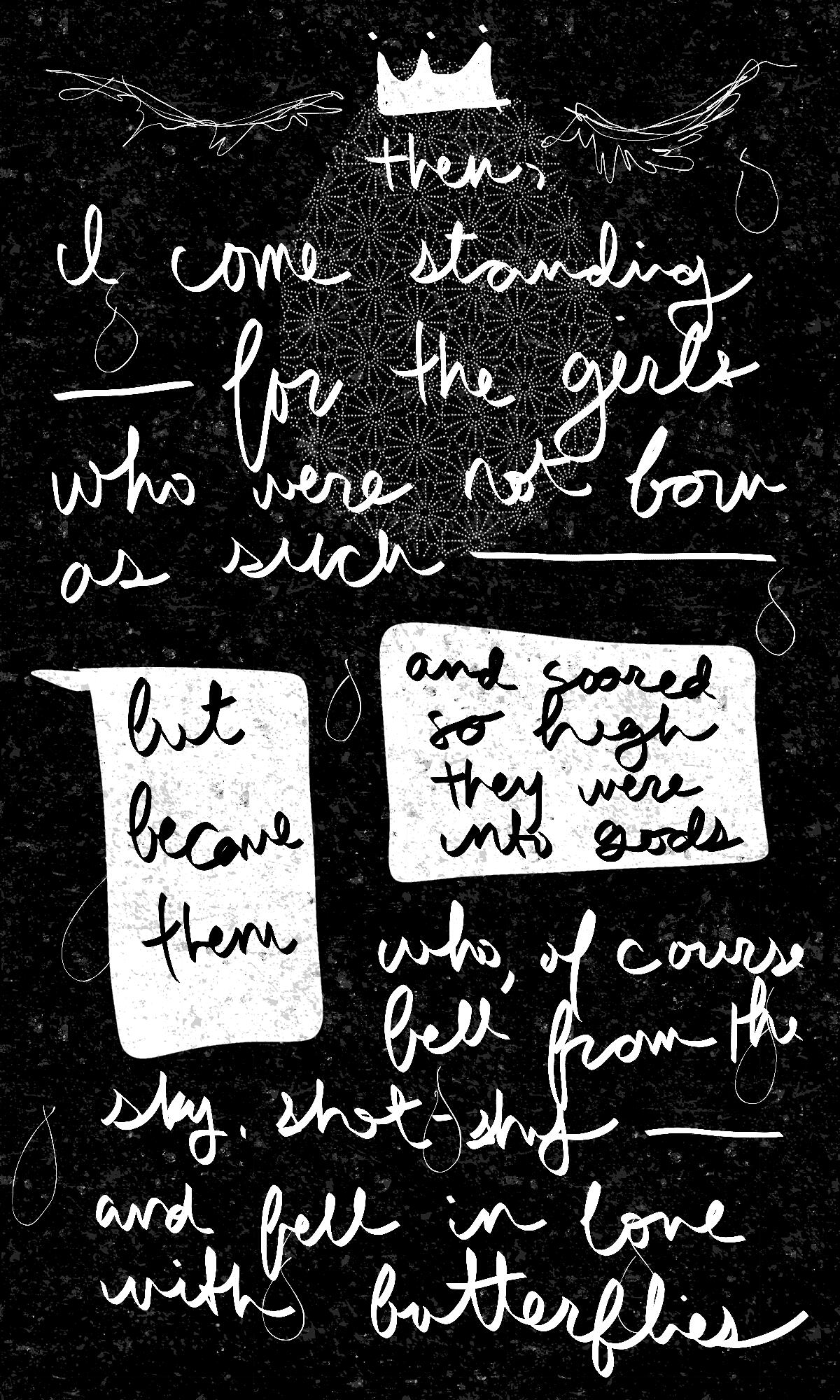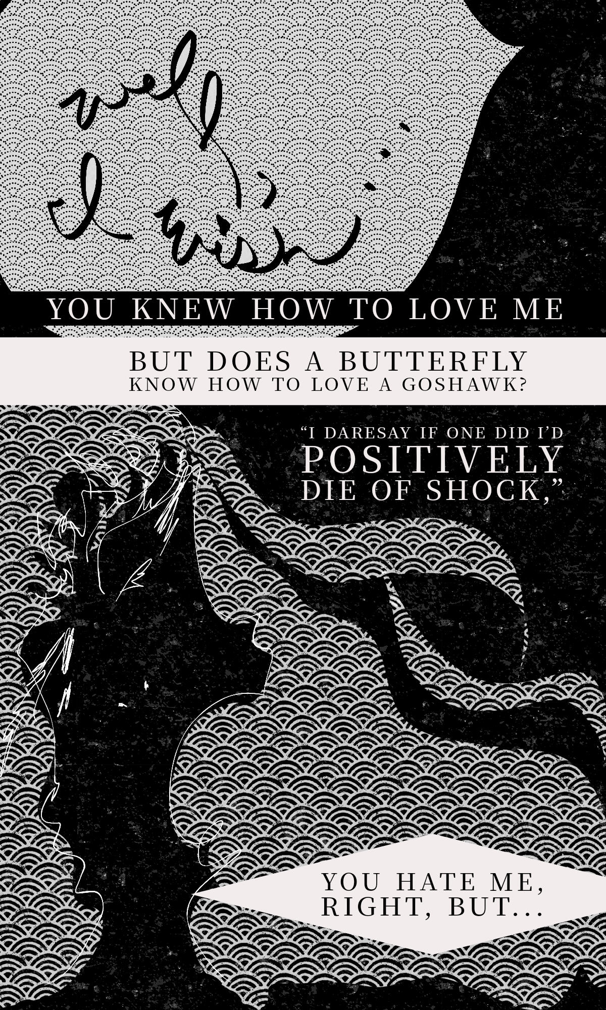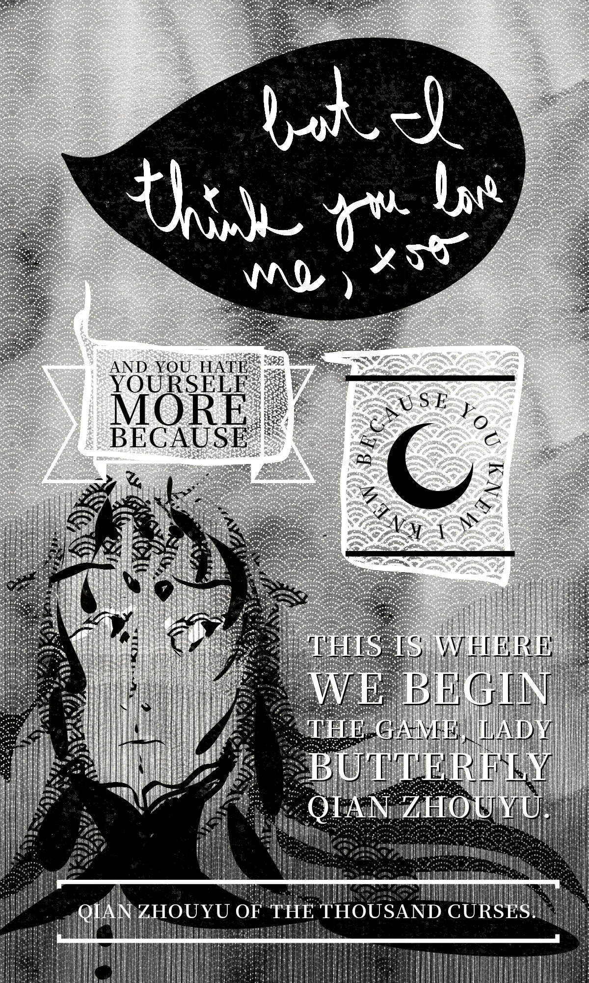 Yue Xianming (he/she) is represented by the goshawk, who is a single-mindedly obsessive bird of prey that soars high in the sky to sight prey from above, whereas her lover Qian Zhouyu (he/him) is a girl in denial, represented by the butterfly, who must hover low to the ground to seek nectar. Their symbolic animals represent their inborn and (forcibly learned through survival) talents; Xianming was forced to learn the talents akin to a god just to survive a severe childhood of sexual trafficking, but now lives happily and hopefully at the side of her beloved, Zhouyu.